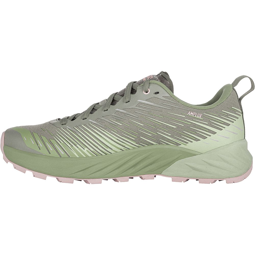 LOWA Amplux W – легкі жіночі кросівки для трейлового бігу, розроблені з урахуванням анатомії жіночої стопи для точної та комфортної посадки. Модель демонструє стабільну поведінку на різноманітному рельєфі: звивистих стежках, м’якому лісовому ґрунті, росистій траві та твердих ґрунтових доріжках. Проміжна підошва потрійної щільності з технологією DYNEVA забезпечує рівномірну амортизацію по всій довжині кросівка. Два компоненти зовнішньої оболонки формують додаткову амортизацію в зоні п’яти та ефективну віддачу енергії в середній і передній частинах стопи. Вбудоване карбонове посилення зменшує втрати енергії та захищає підошву від проколів. Цілісна конструкція верху та полегшений язичок мінімізують кількість швів і знижують ризик натирання. Накладки в області манжети та п’яти підтримують оптимальний баланс між комфортом і гнучкістю. Підошва LOWA® TRAC® зі злегка повернутими шипами забезпечує надійне зчеплення під час швидкого руху, а двоспрямований протектор сприяє ефективному розгону та контрольованому гальмуванню.