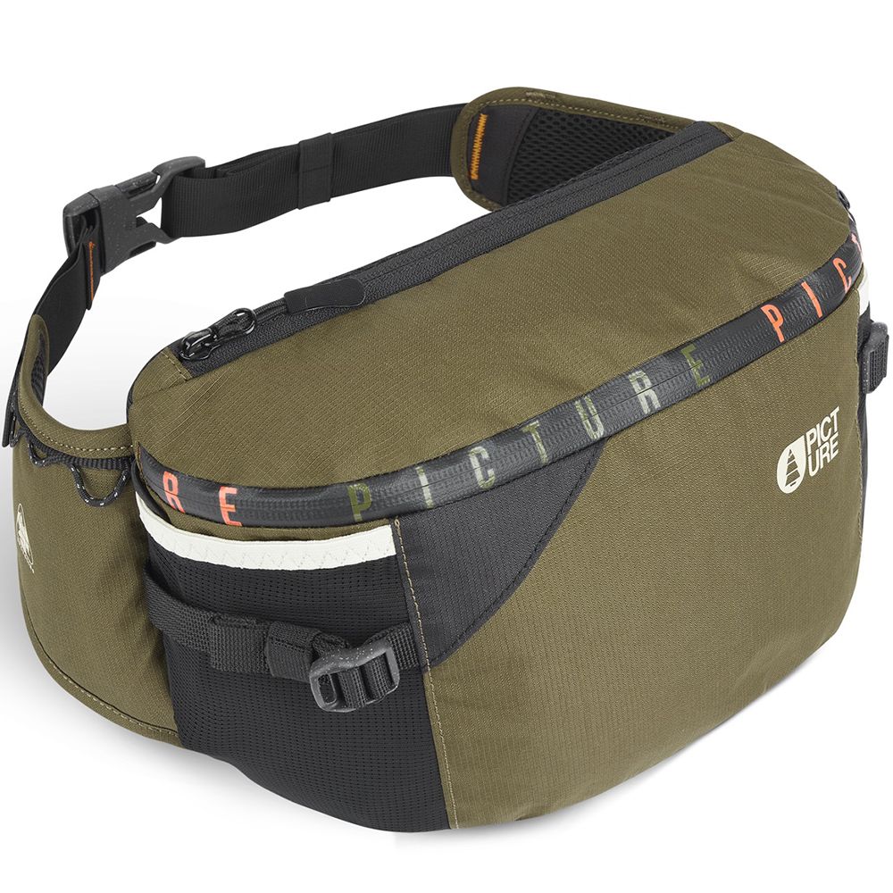 Picture Organic Off Trax – компактна та багатофункціональна поясна сумка. Поліуретанове покриття та водовідштовхувальне просочення без PFC захищає вміст від вологи протягом усього дня. Зручні кишені та бічні стяжки дозволяють компактно розмістити все необхідне. Після закінчення терміну служби сумка легко перетворюється на органайзер для умивального приладдя – достатньо розрізати поясний ремінь по пунктирній лінії, дотримуючись інструкцій.