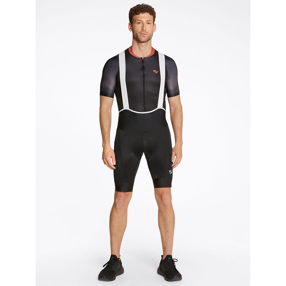 Ziener Nekos X-Race – чоловічі шорти для велоспорту з широкими та зручними лямками. Задня частина виконана із сітчастого матеріалу, який забезпечує відмінну вентиляцію та комфорт при максимальних навантаженнях. Вкладиш X-Race із безшовною конструкцією швидко відводить вологу, а також забезпечує ідеальну амортизацію та вентиляцію. Силіконовий принт Grip Control з внутрішньої сторони манжет фіксує шорти на стегнах, а світловідбиваючі елементи підвищують безпеку в умовах поганої видимості.